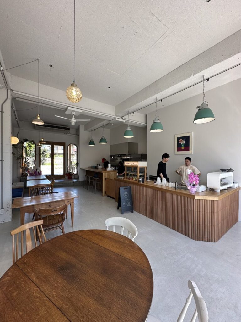 1階がカフェ。2階がワークスペース(2026年3月現在)になっています。お野菜を中心にしたお食事メニューと自家焙煎のコーヒーが楽しめます。