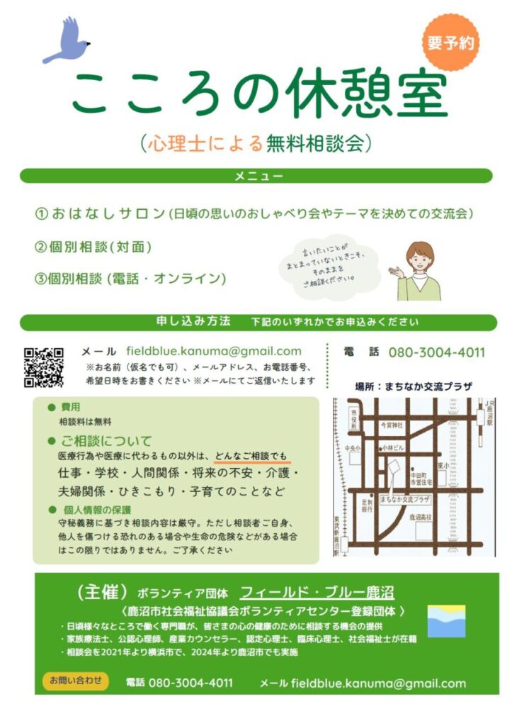 日頃は様々な機関で働く心理の専門職が、メンバーです。言いたいことがまとまっていないときこそ、そのままをご相談ください。こころの休憩室を目指しています。対面、電話、オンラインの形で行っています。